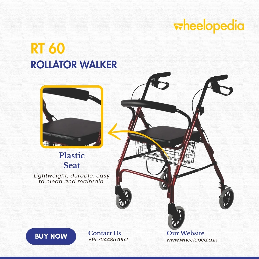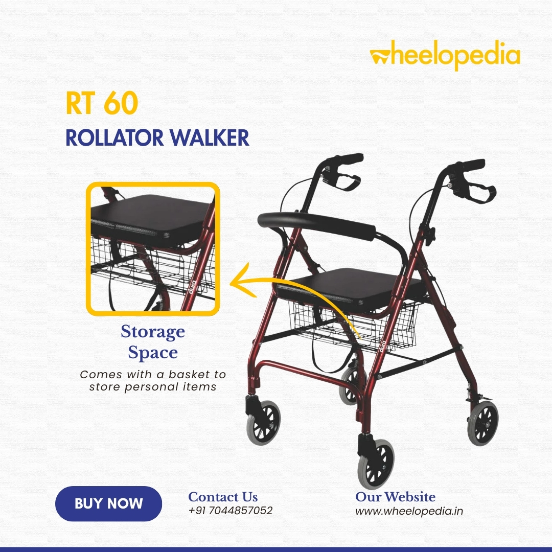 A spacious storage bucket beneath the seat allows users to carry personal belongings, medicines, or essentials safely and discreetly—perfect for daily use. The height‑adjustable handles ensure a customised fit for users of different heights, promoting better posture and reducing strain during walking.