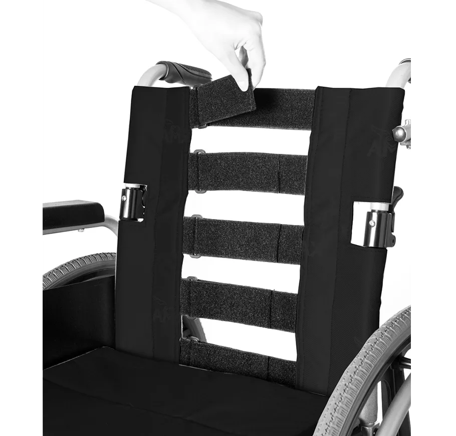 Unlike conventional wheelchairs, the backrest uses adjustable Velcro straps to change the tension and conform according to the wheelchair user. This helps prevent slouching and the hammock effect.